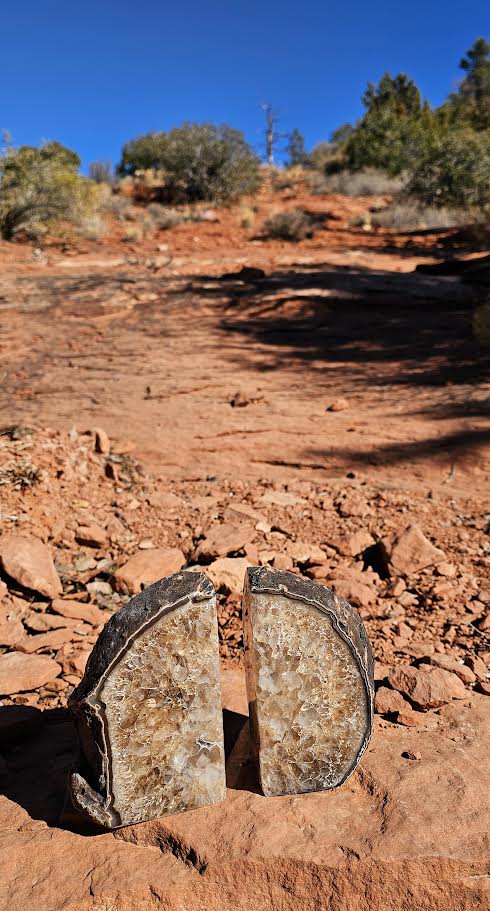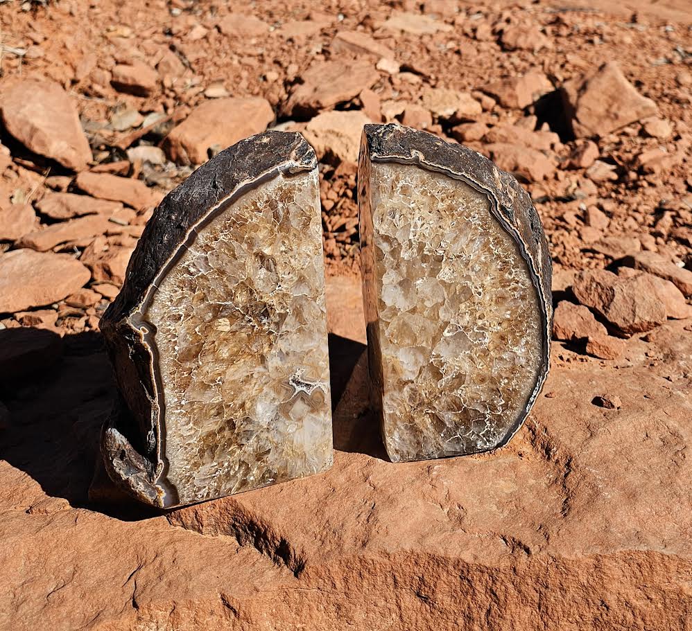 Our georgous bookends are crafted in Brazil from an agate geode. They dazzle with crystalized white/clear, and brown layers of color. Each end weighs over 2 pounds, perfect for keeping books in place or just showing off Mother Earth's beauty.