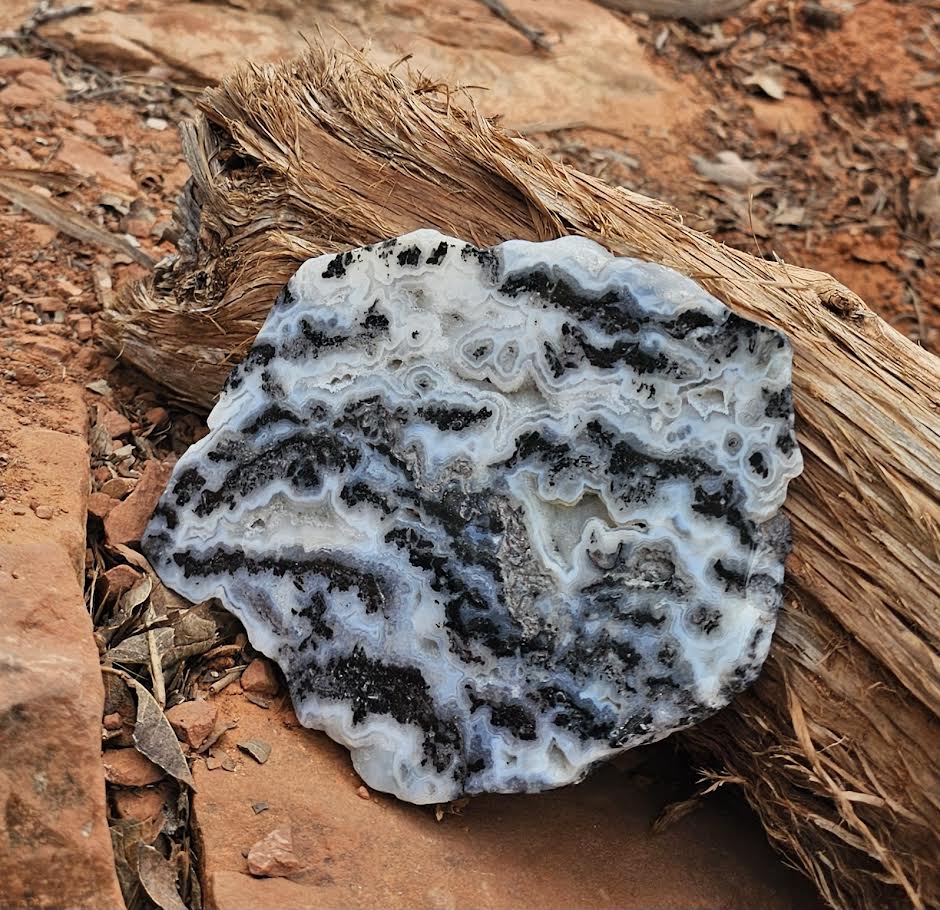 This Zebra Lace Agate Slab is a stunning and unique addition to any collection. With its distinctive zebra-like patterns and smooth surface, it is a must-have for enthusiasts and collectors alike. Made of natural agate, it is also believed to have grounding and calming properties.