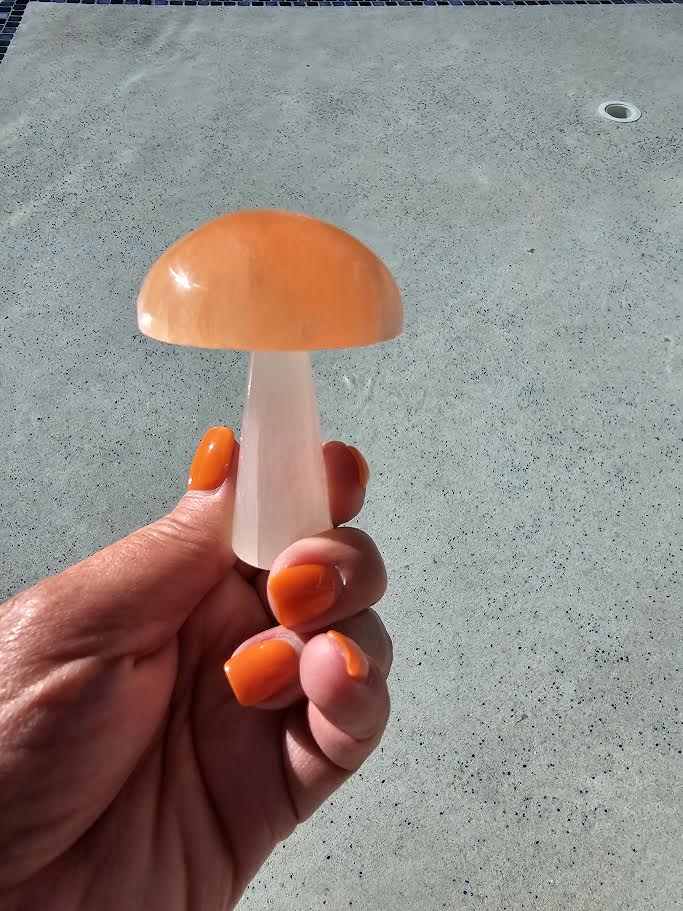 Our Selenite Mushrooms have a peach colored cap covering the stem in traditional selenite white. A great gift to receive!