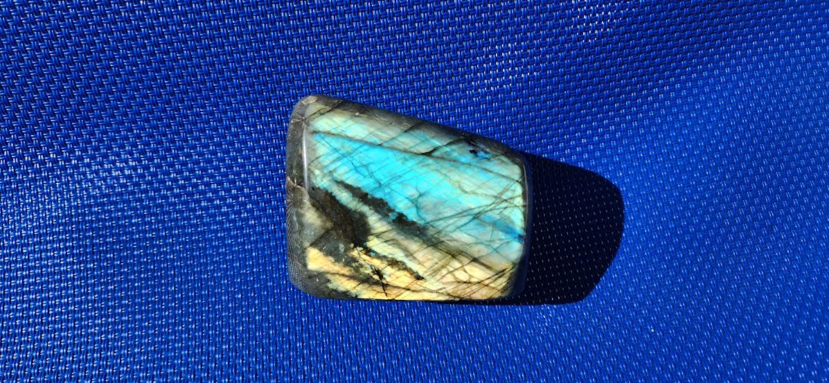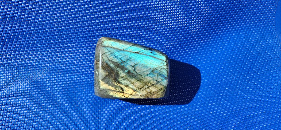This free-form Labradorite is an exquisite natural specimen. Its unique feature is the beautiful iridescent tourquoise blue, and gold flashes of light which are present in the stone. Hand picked, almost the entire face of the stone flashes! Ideal for collectors, it's the perfect addition to any gemstone collection.