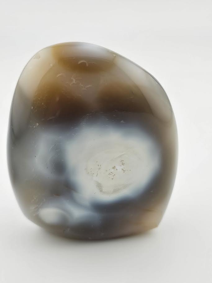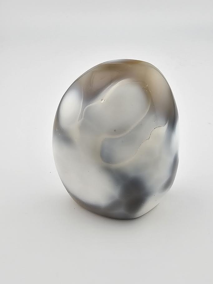 This Orca Agate Free Form boasts unique characteristics, making it a one-of-a-kind addition to your collection. Its irregular shape and distinctive shades of grey, blue, cream, and brown create a captivating design.