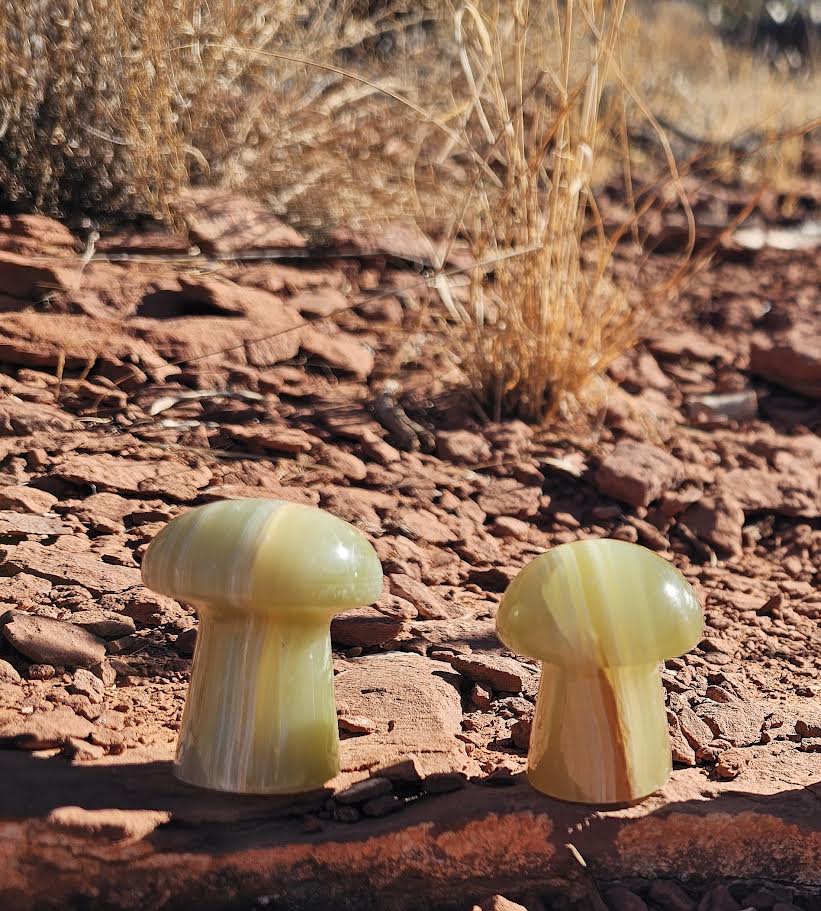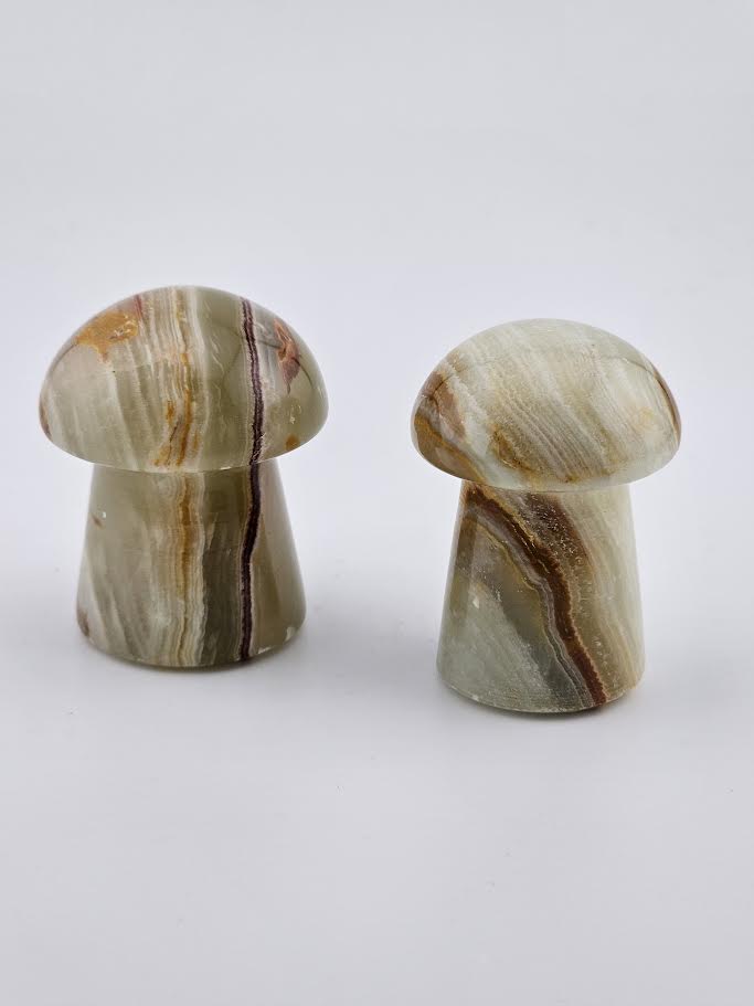 Our Green Onyx Mushrooms are a cute, chunky version of the real thing. They are carved from Mexican onyx which is formed by layers of earth tone Chalcedony and Quartz. Each one is sure to please.