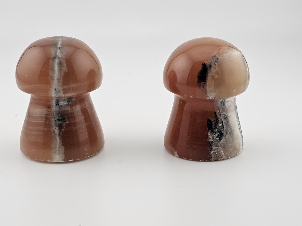 Our Honey Calcite Mushrooms are a cute, chunky version of the real thing. They are carved from calcite containing a variety of banded colors including dark orange, white and black. Each one is sure to please.