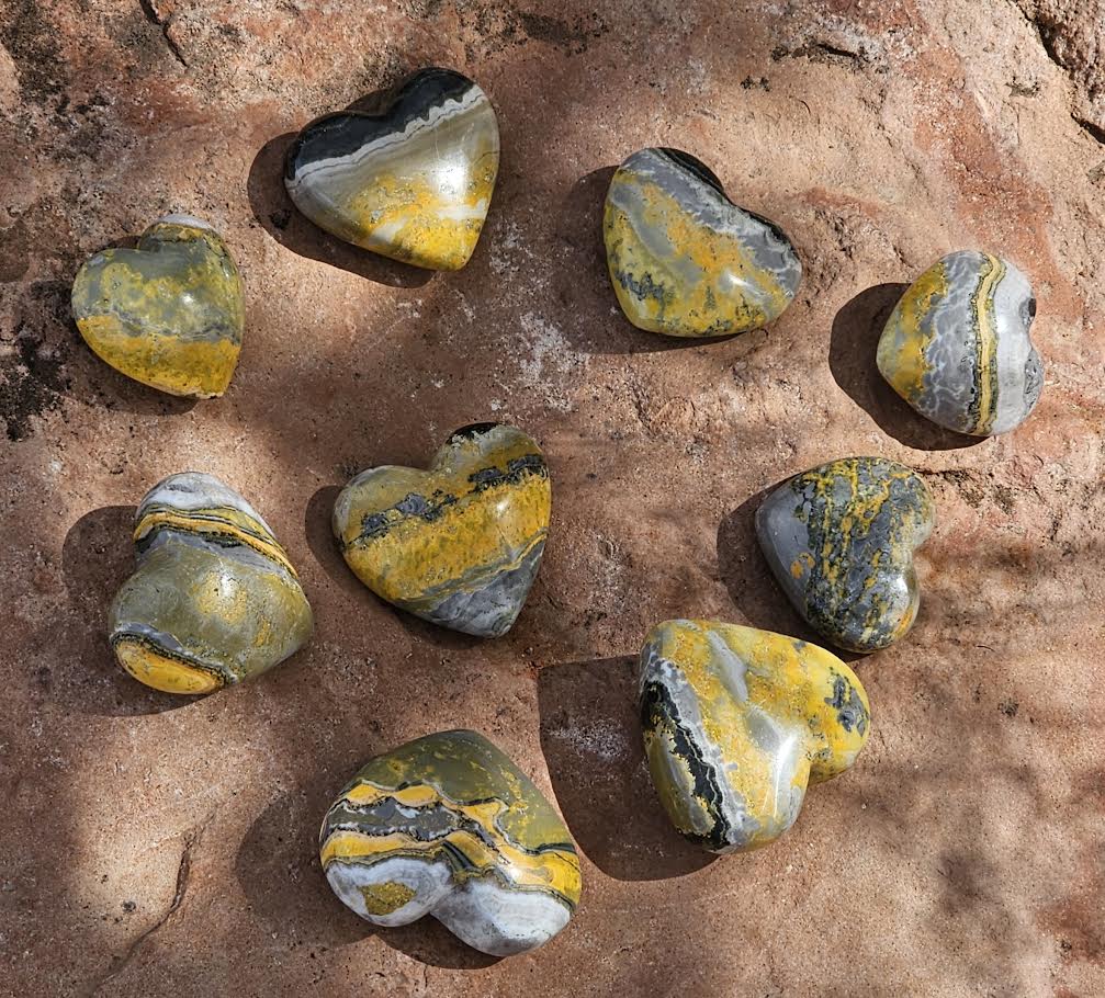 This Bumblebee Jasper Heart exhibits the distinctive volcanic stone's signature yellow and black striations, sourced exclusively from Indonesia. Mineralogically composed of hematite, calcite, anhydrite, pyrite, and sulfur compounds, it's prized for its vibrant coloration and purported energetic properties. The heart-shaped cut enhances its aesthetic appeal while metaphysical practitioners value it for stimulating the solar plexus chakra and promoting personal power. Each specimen displays unique banding patterns, ensuring an authentic one-of-a-kind crystal. Please wash hands after handling due to the trace presence of arsenic and sulfur which are inherent in the stone.