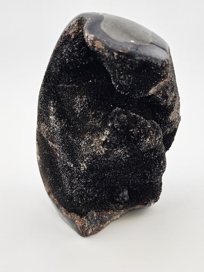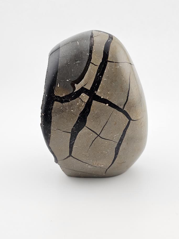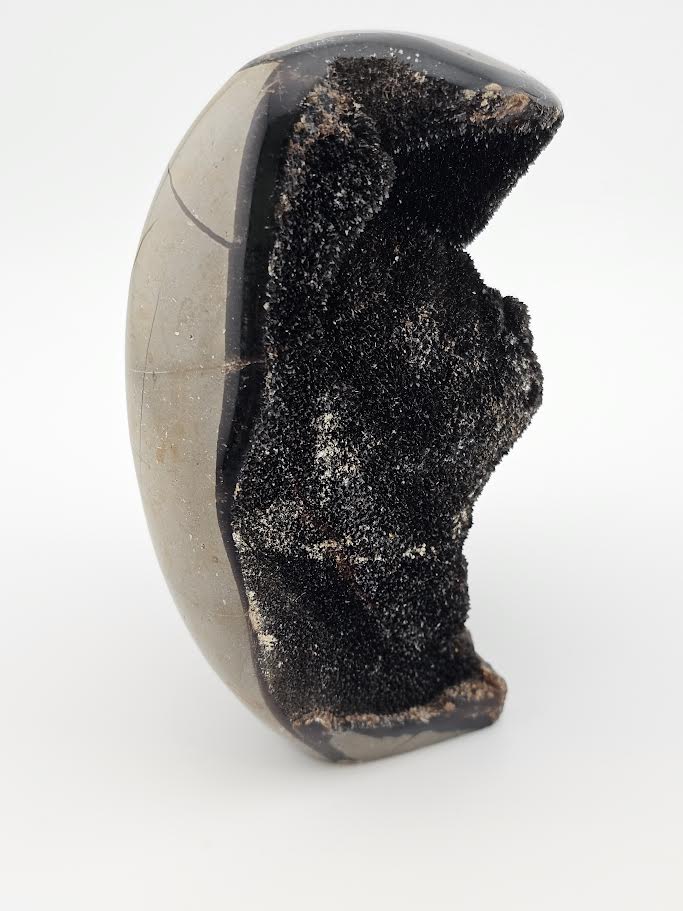Discover the beauty of the Septarian Dragon Egg. This unique and mesmerizing stone, formed over millions of years, features a combination of calcite, aragonite, and chalcedony. Each egg contains stunning natural patterns of velvety crystals.